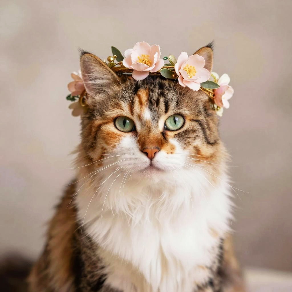 Portrait of a regal furry calico cat wearing a delicate floral crown, luxurious tri-colored fur with intricate shading, soft focus background with pastel tones, romantic and whimsical