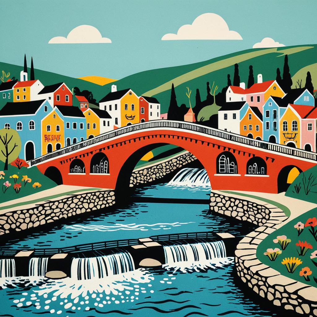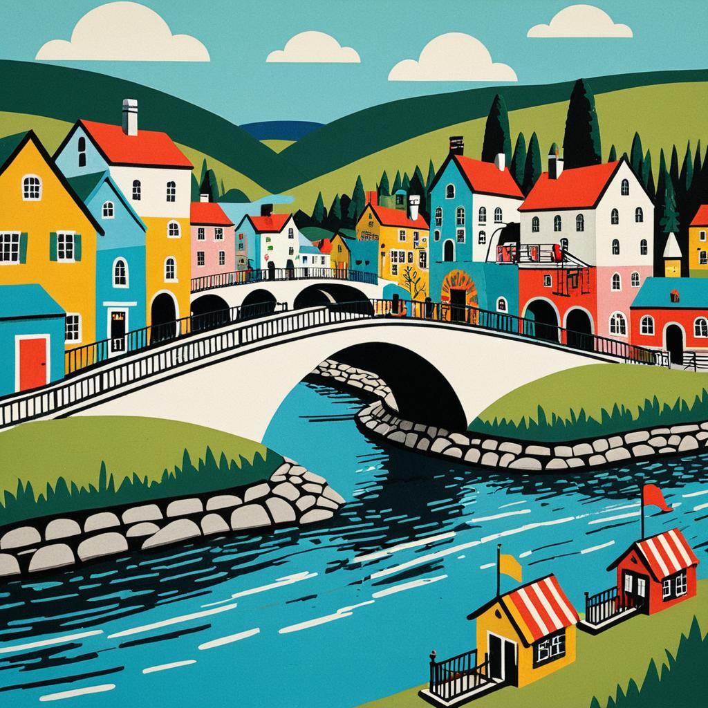 A whimsical folk art depiction of a charming riverside town with playful pop-art colors. Features arched bridges, cascading waterwheels in a style inspired by colorful graphic patterns and minimalistic shapes.