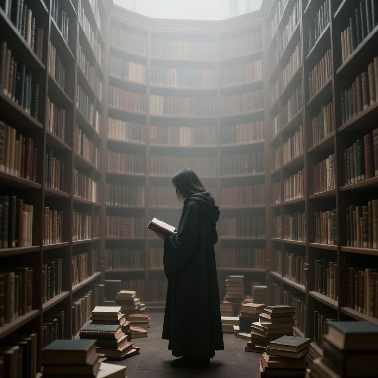 A photograph of a dimly lit, circular library aisle with tall, dark wooden bookshelves on either side, filled with multicolored books. At the center, a silhouette of a person with long hair, wearing a long dark coat, stands holding a book, looking down. Stacks of books are scattered on the floor in front and around them. Soft light from the ceiling creates a misty effect, highlighting the shelves and books. The atmosphere is quiet and mysterious.