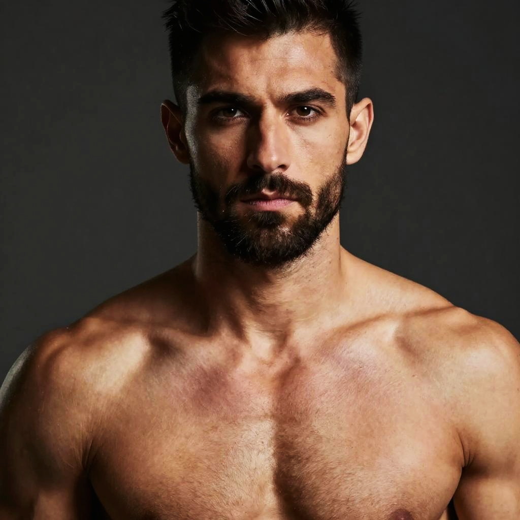 A close-up portrait of a muscular man with a well-groomed beard and expressive eyes, highlighting his defined chest and shoulders. The image is captured with dramatic lighting against a dark, neutral background, emphasizing the subject's physique and intense gaze.