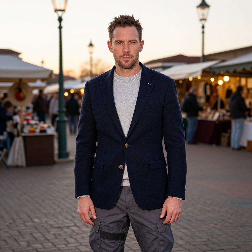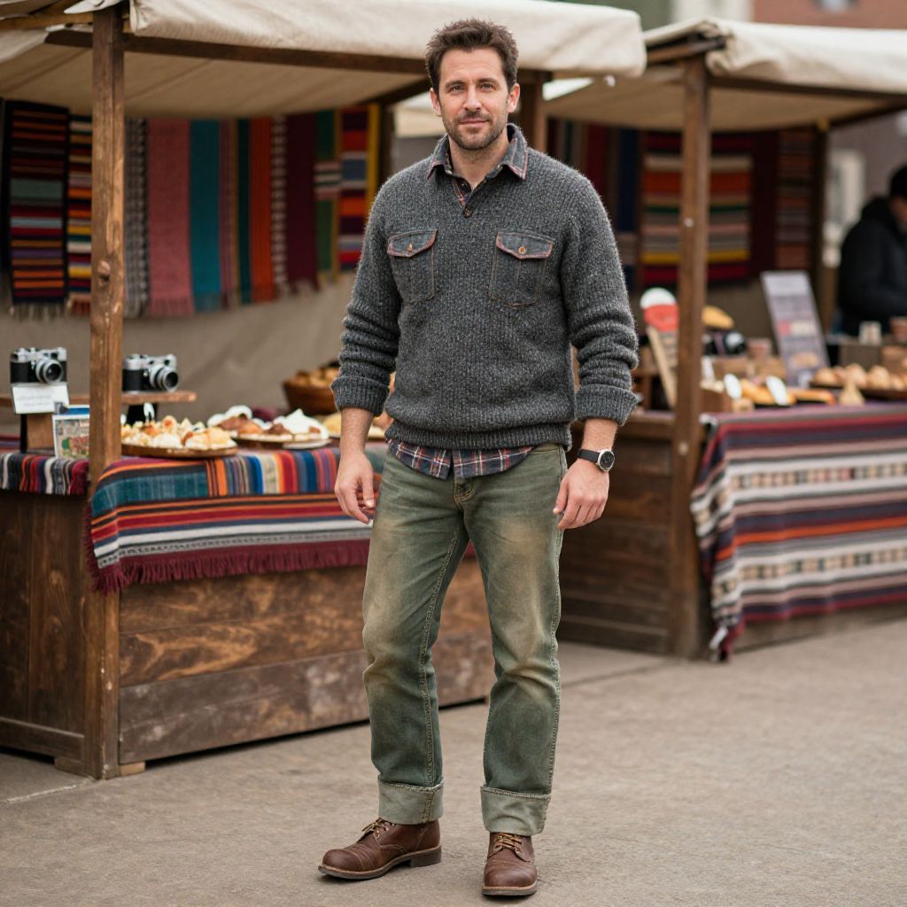 Photograph of a middle-aged white man standing in a bustling outdoor market. He has short, dark brown hair, a trimmed beard, and a slightly rugged appearance. He wears a light blue button-up shirt, a white puffer jacket, dark blue jeans with cuffs rolled up, and tan leather shoes. The background includes several people, some sitting at tables and others walking, with white tents and wooden buildings. The market is set in a cobblestone plaza with a mountain range in the distance under a cloudy sky. The man stands confidently in the center, facing the camera.