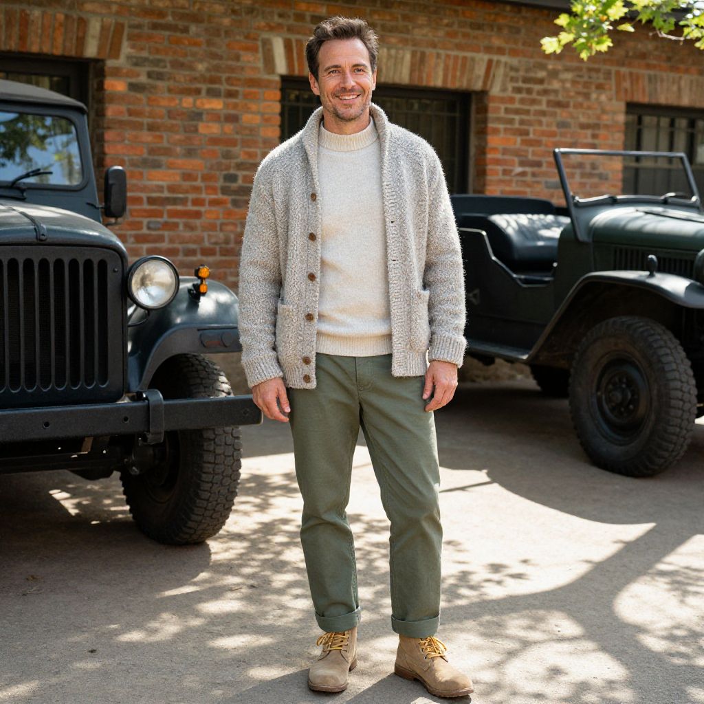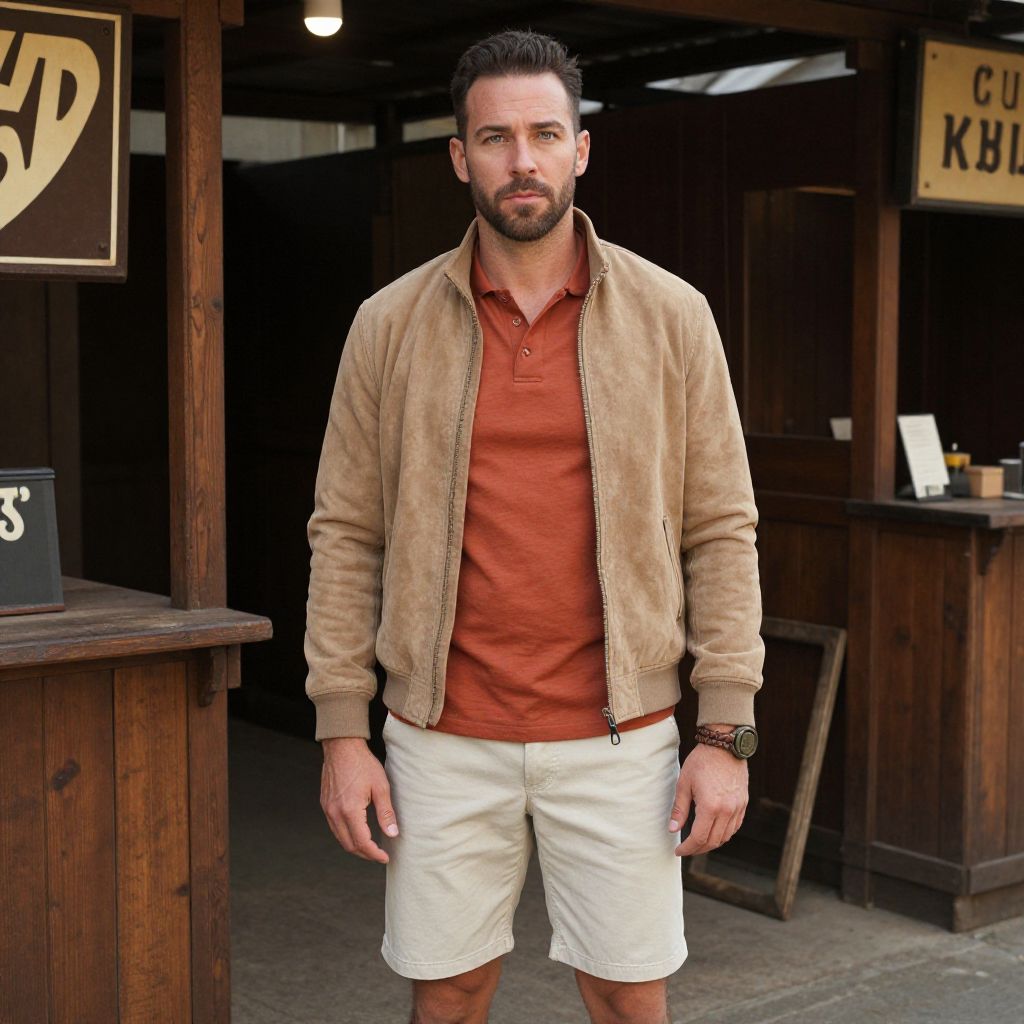 A man, relaxed-fit chambray shirt, dark denim jeans, rugged brown suede boots, cream-colored bomber jacket, subtle plaid pattern, bustling après-ski scene, oversaturated film style, confident smile, warm atmosphere. Man has masculine face and piercing eyes