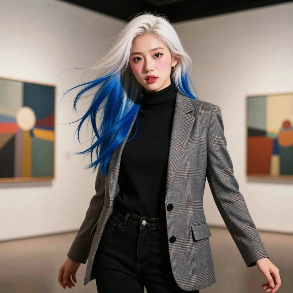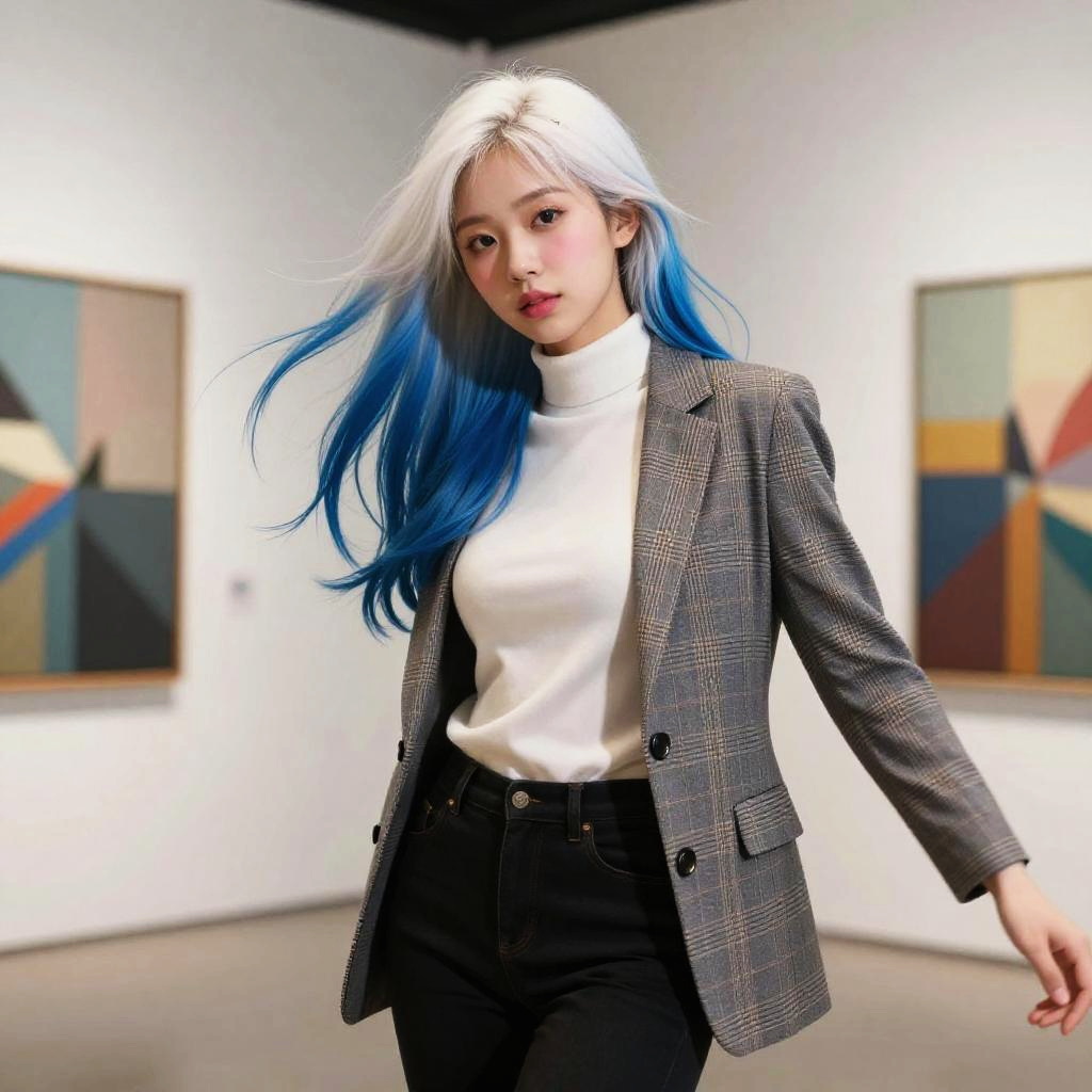 Portrait of a young East Asian woman with striking two-tone hair dyed white and blue, wearing a grey plaid blazer over a black turtleneck sweater and black cropped trousers. She is posed dynamically inside a modern art gallery with abstract paintings on the walls. The image shows high detail in facial features, makeup including lipstick and blush, and realistic lighting.