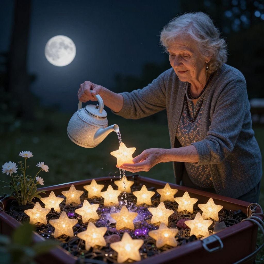 An elderly woman tenders a floating garden of glowing, edible stars, watering them with bottled moonlight and singing them lullabies from forgotten galaxies.