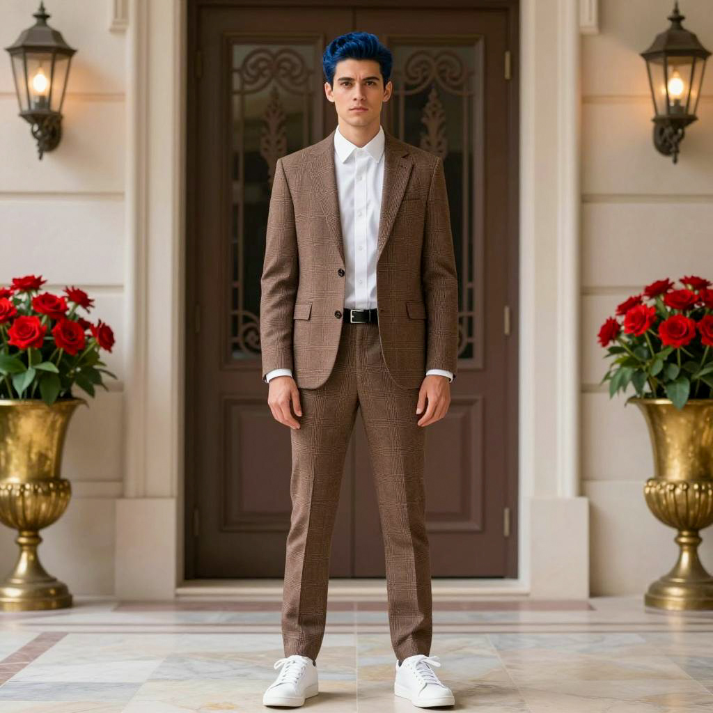 Cocomelon custom outfit, photorealistic, male model standing in front of ornate doorway, brown checkered suit with black belt, white dress shirt, white sneakers, dark blue hair, serious expression, symmetrical composition, marble and stone background, red flowers in brass pots on both sides, luxury mansion, modern formal style, crisp ures, balanced lighting