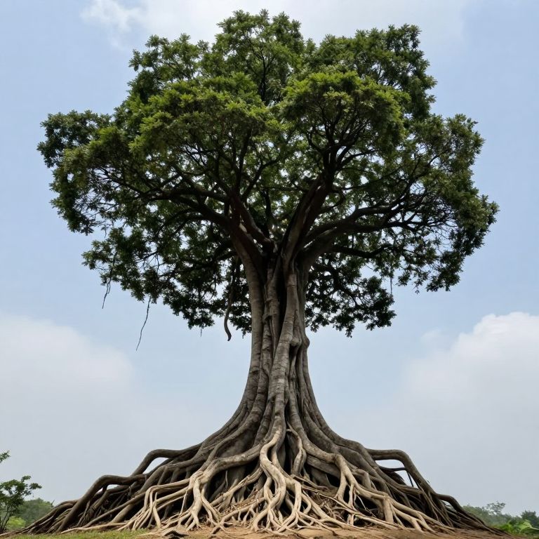 A colossal tree stands defiantly against gravity, its gnarled roots sprawling upward toward the heavens while its branches descend like dark tendrils, mirroring the earthbound world below.