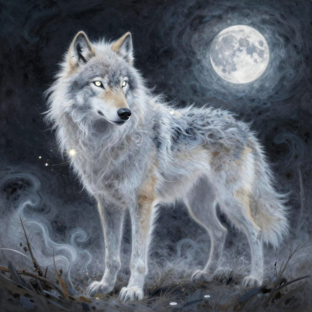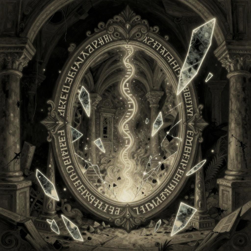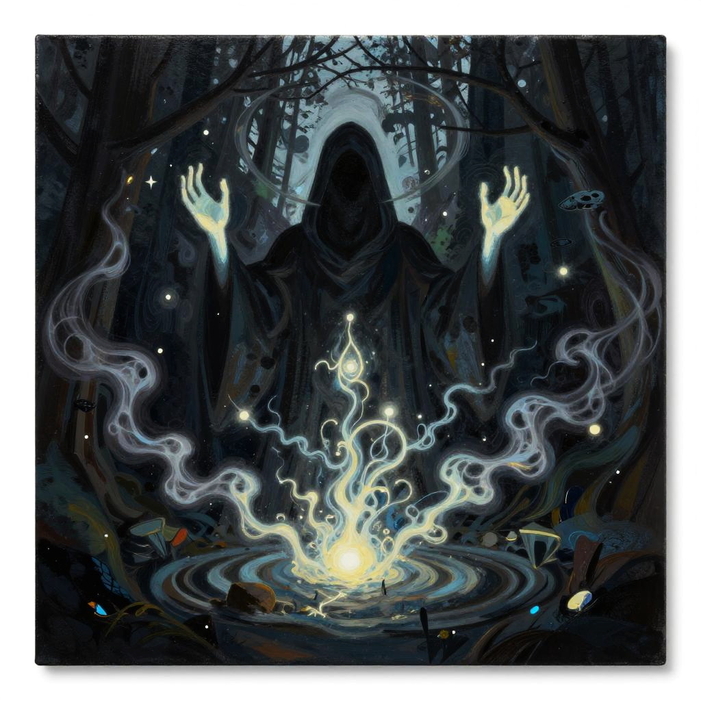 Abstract dark concept artwork featuring a mysterious hooded figure with glowing hands, conjuring ethereal spirits within a smoky, flickering ritual circle in a dense, shadowed forest. The image emphasizes bold contrasts and an immersive, mystical atmosphere.