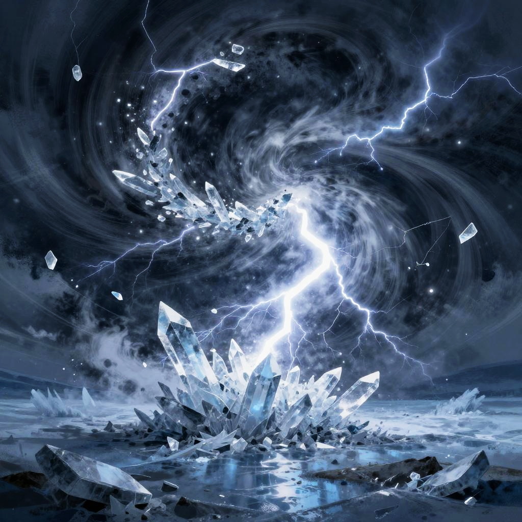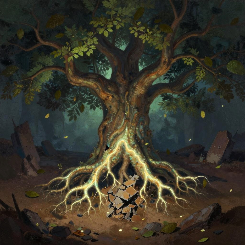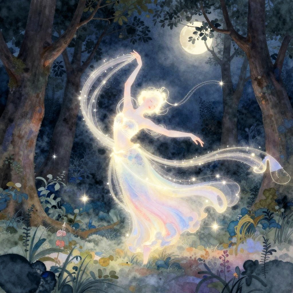An abstract artwork of a mysterious hooded figure summoning ethereal spirits, with glowing hands, smoky shadows, and flickering lights, in a shadowed ritual circle in a dense forest, created in dark concept art with bold contrasts, mysterious and immersive