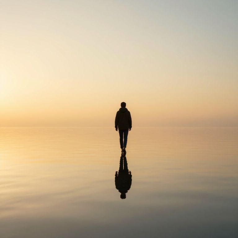 A serene digital artwork captures a solitary figure walking toward the horizon on a reflective, mirror-like surface, evoking a sense of introspection and nostalgia, with golden-hour lighting enhancing the ethereal atmosphere.