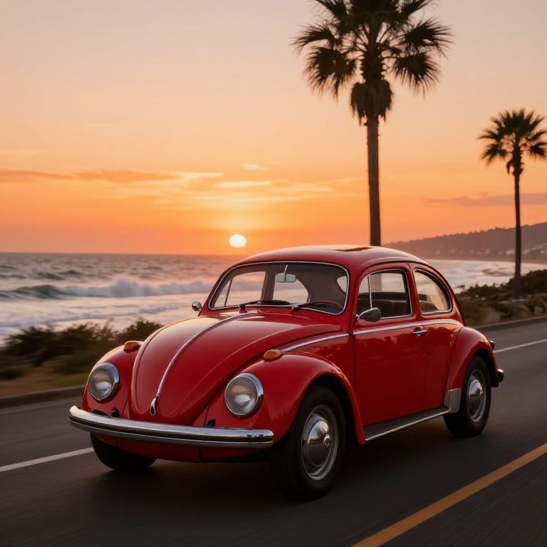 Vocho Volkswagen Beetle driving along a coastal road at sunset, reflections of the orange sky on its shiny red paint, waves crashing nearby, palm trees swaying, scenic, cinematic lighting emphasizing the car's nostalgic design and joyful summer feeling.
