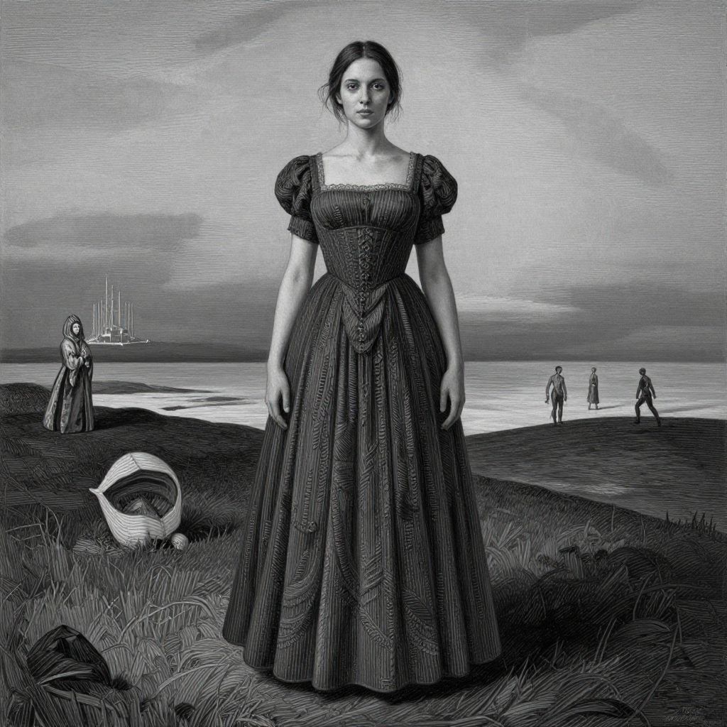 Black-and-white digital drawing of a Victorian woman in a puffed-sleeve dress standing on a grassy shore, with distant figures and a sailing