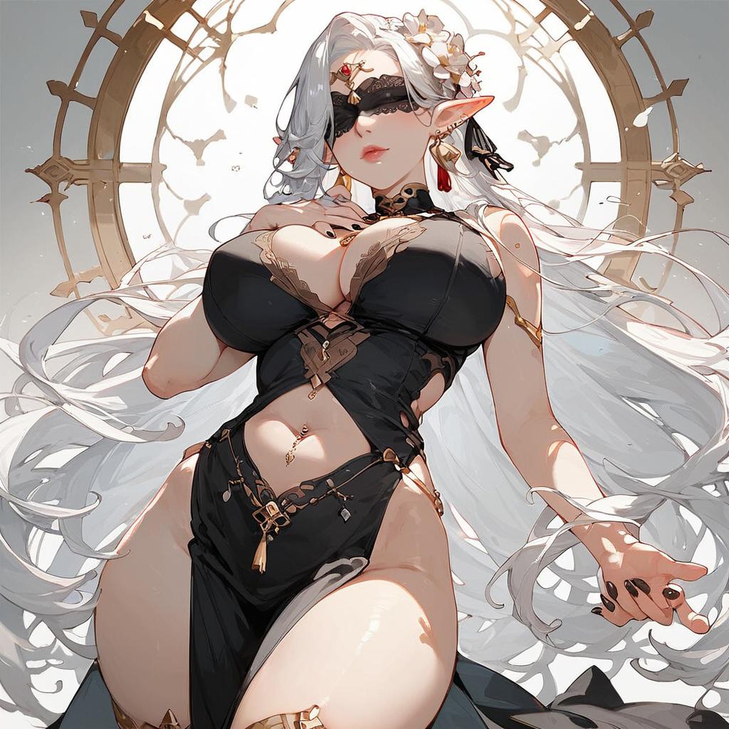 Score_9, score_8_up, source_anime, female, big breasts, black dress, blindfold, hand on breast, hand jewelry, golden embroidery, pelvic curtain, mature female, necklace, tassel earrings, flower in hair, white hair, black nails, cleavage, white background, long hair, garter straps, 5 fingers, humanoid pointy ears, belly chain, navel cutout, navel piercing, panties