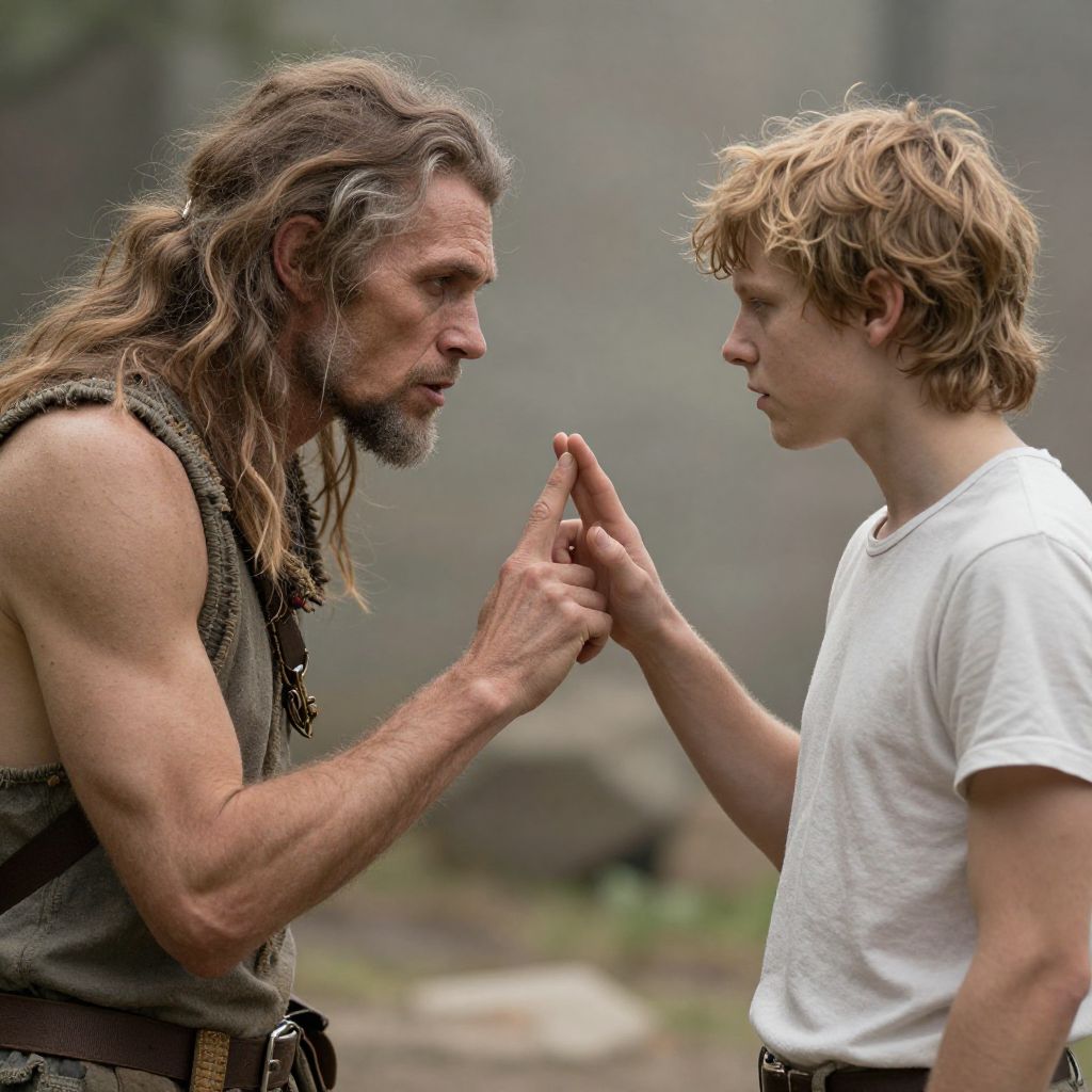 Photograph of two young men in a natural outdoor setting. The man on the left has long, wavy, brown hair, a beard, and wears a sleeveless, dark brown, leather-like vest. He has a muscular build and is intently focusing on the other man's hand, holding it gently with both of his hands. The man on the right has short, messy blond hair and wears a plain white t-shirt. He has a slender build and looks back at the older man with a calm expression. The background is blurred, featuring green foliage and a gray, stone wall. The image captures a moment of connection and understanding between the two.