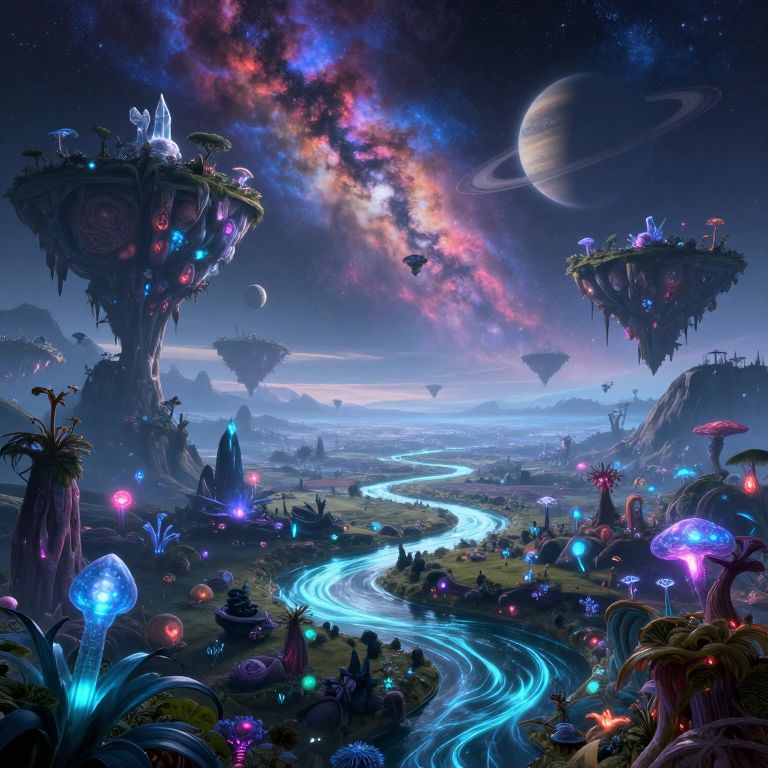 Digital fantasy artwork depicting a vibrant, otherworldly landscape. The scene features floating crystal islands adorned with glowing bioluminescent plants and mushrooms, illuminated by various colors. A luminous blue river snakes through the foreground, leading to a distant horizon. The night sky is filled with stars and a large, glowing planet. The Milky Way galaxy stretches across the sky, adding a cosmic feel. The islands are surrounded by exotic flora, including pink and purple flowers. The overall color palette includes deep blues, purples, and pinks, creating a magical and ethereal atmosphere.