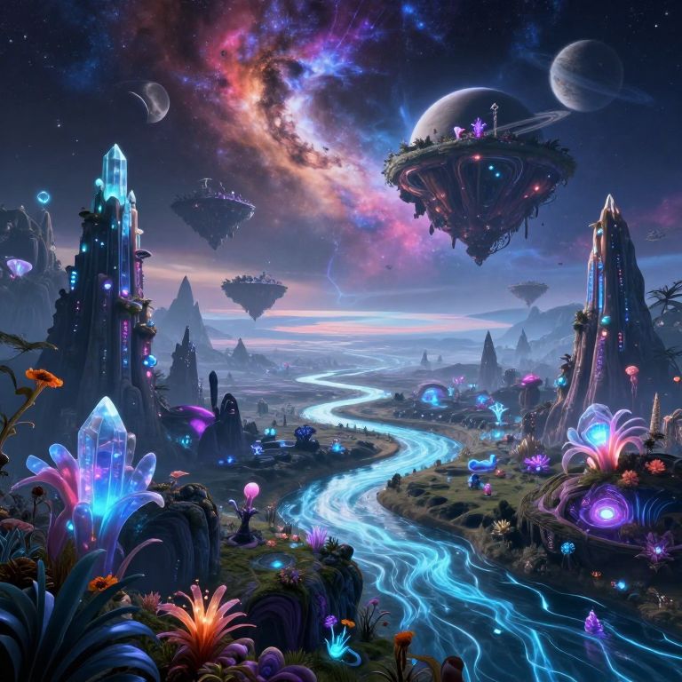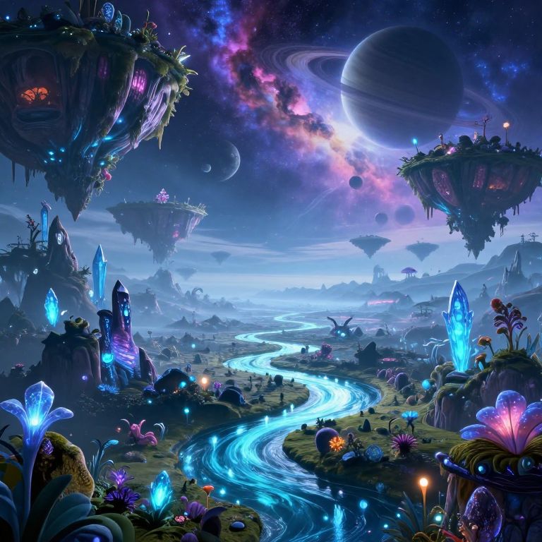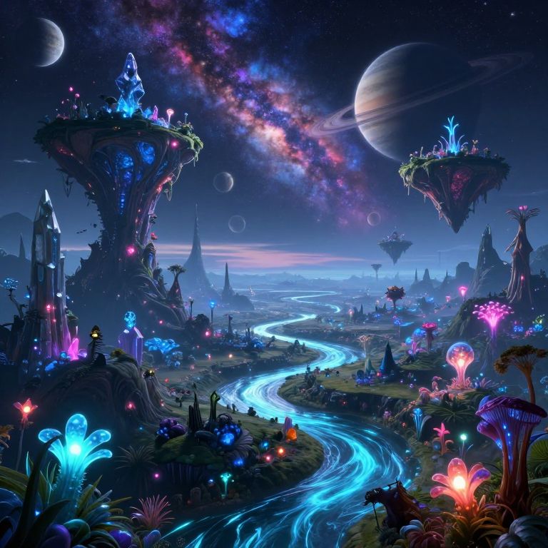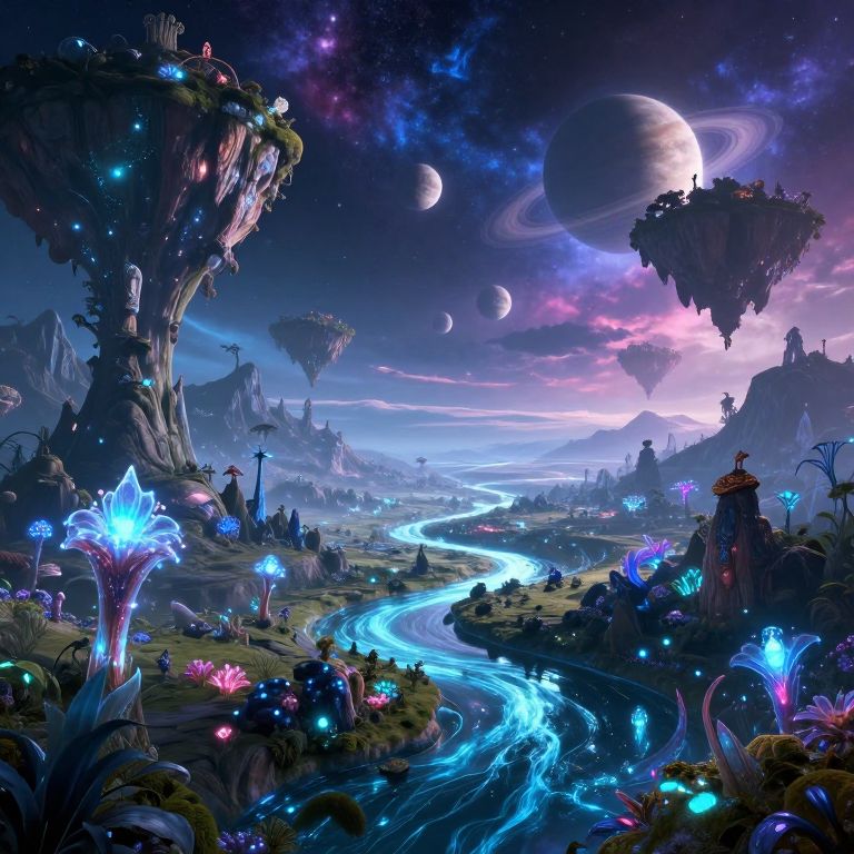 A breathtaking alien landscape, on a distant planet, featuring towering, bioluminescent flora and floating islands suspended in a vibrant, nebula-filled sky, The terrain is a mix of crystalline formations and glowing, otherworldly plants, Rivers of liquid light flow through the valleys, casting an ethereal glow across the scene, Strange, luminescent creatures can be seen in the distance, blending seamlessly with the fantastical environment, The horizon is dotted with multiple moons and a giant, ringed planet, adding to the surreal beauty of this extraterrestrial world