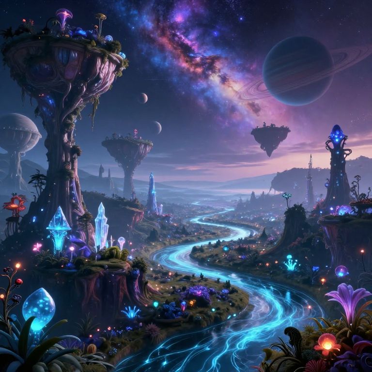 Fantasy CGI landscape with glowing bioluminescent plants, floating crystal cities, a glowing river, a large planet in the sky, and a vibrant