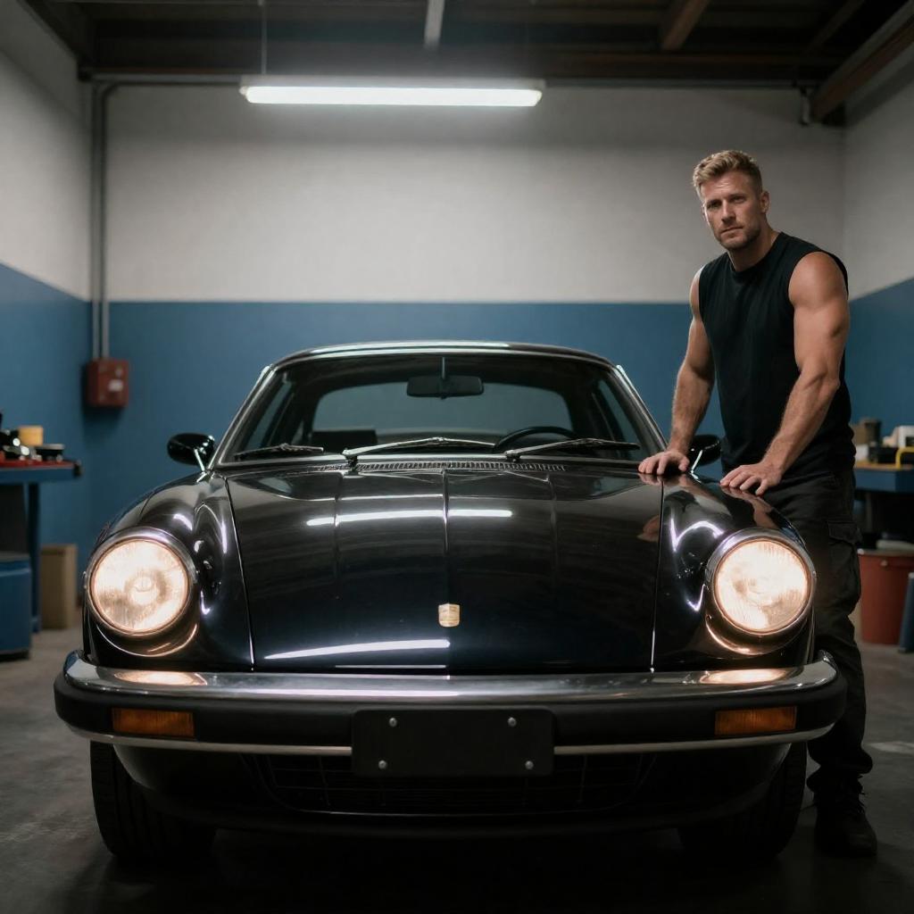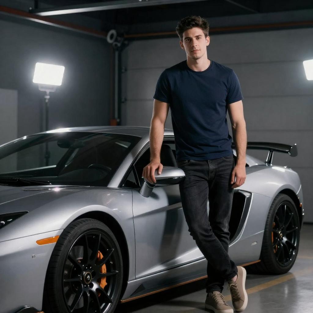 Photograph of a young man with short dark hair, wearing a navy t-shirt and dark jeans, standing beside a silver sports car with black wheels in a dimly lit garage. He rests one hand on the car's roof, looking at the camera. Bright lights in the background create a dramatic effect.