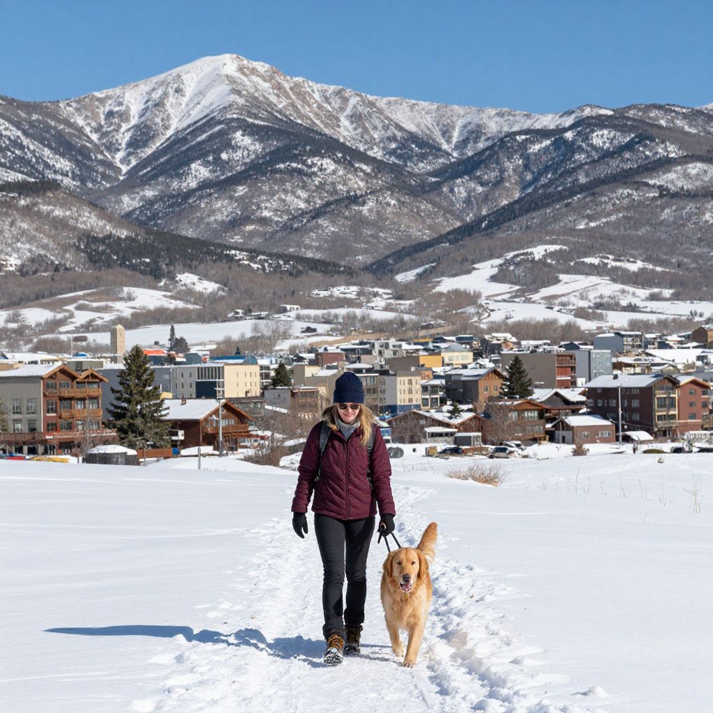 Woman enjoying a winter hike with her golden retriever on a snowy trail in Aspen, Colorado, with majestic snow-capped mountains and a picturesque town in the background.