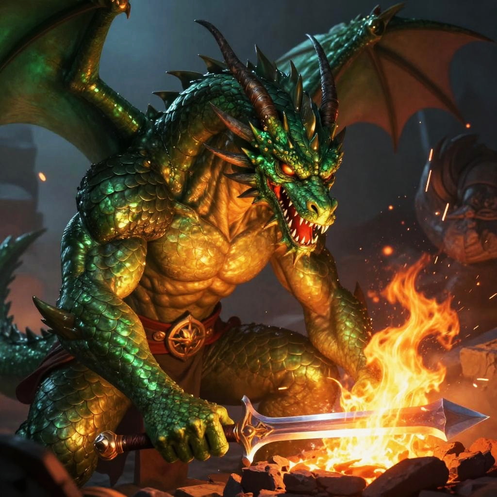 Digital fantasy artwork of a muscular, black-scaled, horned dragon warrior wielding a glowing sword, standing amidst a stormy, cloud-filled sky.