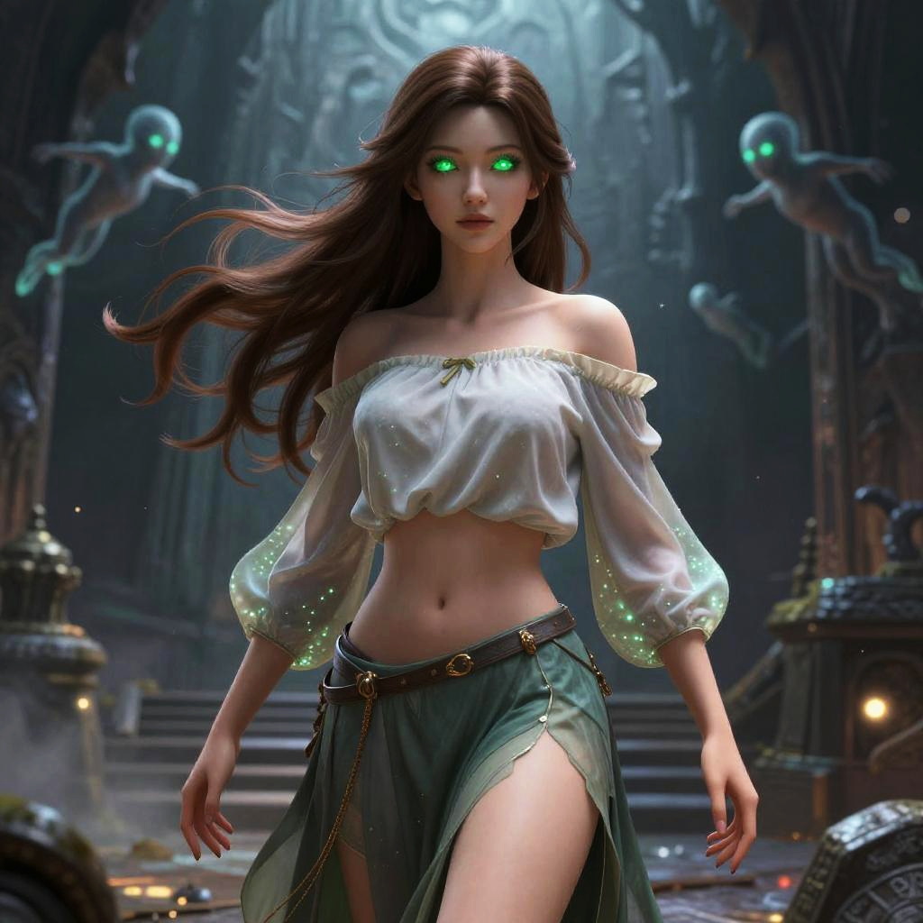This is a highly detailed CGI fantasy artwork depicting a young woman with glowing green eyes and long brown hair, walking through a dimly lit, mystical, and ornate temple. She wears an off-the-shoulder, white, translucent blouse with puffed sleeves and a green, high-slit skirt with a brown belt. Her midriff is exposed, showing a toned stomach. The background features intricate, dark stone architecture with two ghostly, green-eyed figures floating in the air. The scene is illuminated by soft, ethereal light, adding a magical atmosphere. The artist's style is realistic with a fantasy twist, emphasizing the supernatural elements.