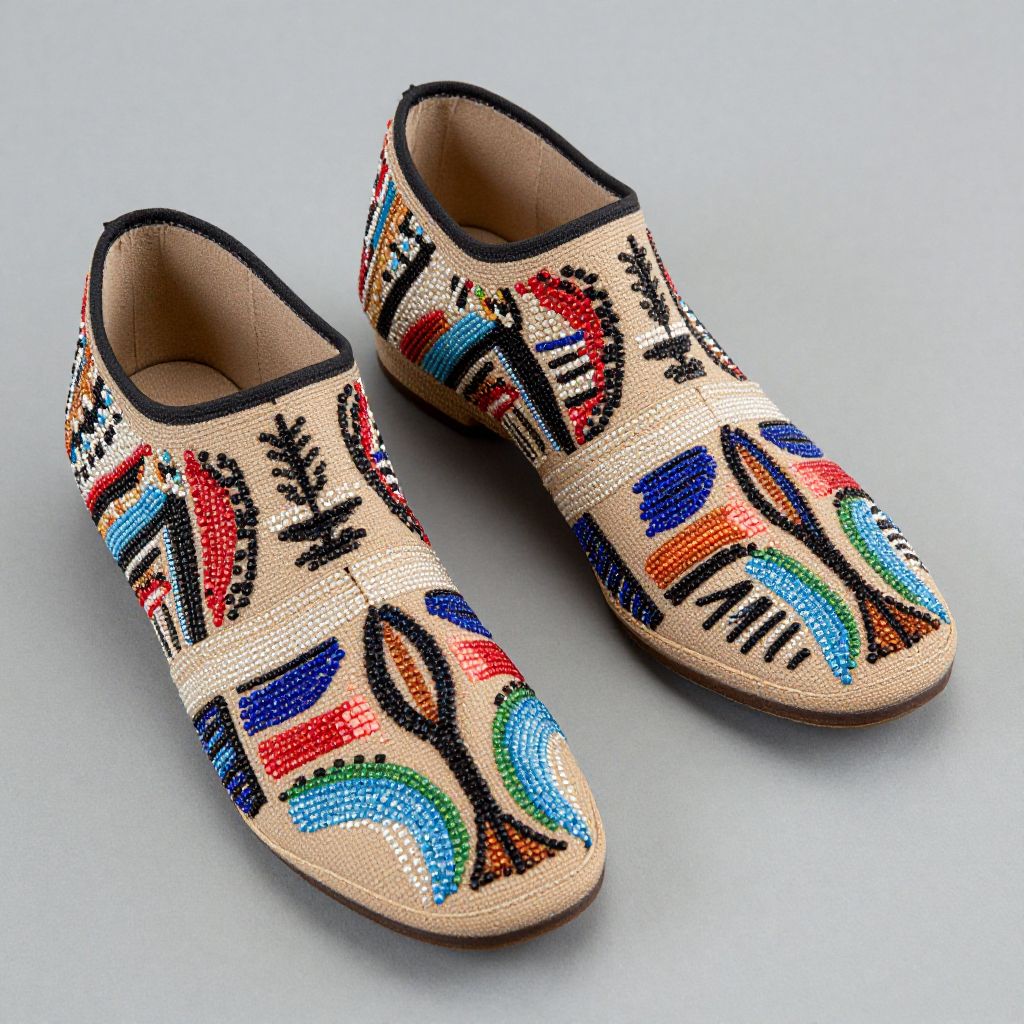 STEPPING OUT: BEADED STEVE MADDEN SHOES by Teri Greeves (Kiowa/Comanche) of commercial shoes, glass beads, 2017. Among the Kiowa, the men were traditionally the pictorial artists. In contrast, Kiowa women created abstract patterns to encode their knowledge of the world. These shoes celebrate those female artists. Each pair of images shows an abstract pattern drawn from Kiowa parfleches (hide containers) or from the beadwork on moccasins, cradleboards, and other items, and pairs that design with the woman who may have created that pattern and its meaning. Photograph by Stephen Lang.