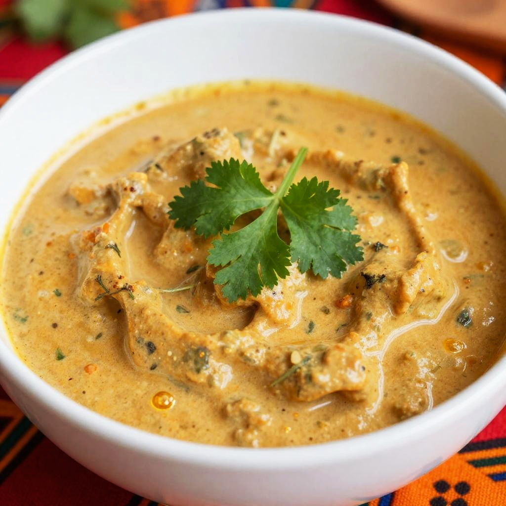 Photograph of a bowl of rich, creamy orange chicken curry, garnished with fresh green cilantro leaves. The curry has visible chunks of chicken, herbs, and spices, with a slightly thick consistency. The white bowl contrasts with the vibrant curry, and a colorful, patterned tablecloth in the background adds a festive feel. The lighting highlights the curry's texture and color, making the dish appear appetizing and flavorful.