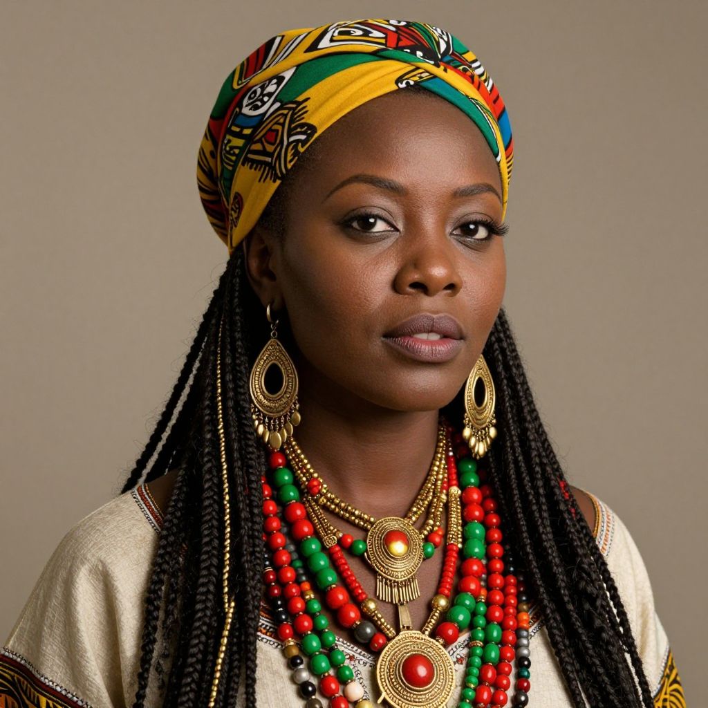Photograph of a dark-skinned African woman with long braids, wearing a colorful headwrap, gold earrings, layered red and green bead necklaces
