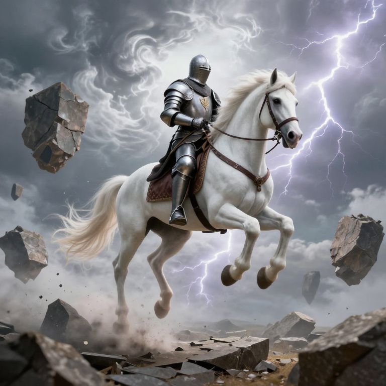 Digital artwork of a silver-armored knight riding a white horse amidst flying rocks and lightning, set against a stormy sky.