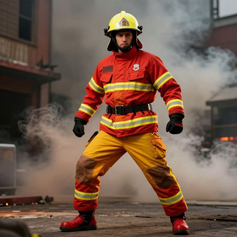 A person is wearing a red and yellow fire suit with a helmet on their head, black gloves, and red boots. The individual stands confidently in a dynamic pose, with a strong, athletic build and a determined expression, embodying the spirit of a firefighter. The background features a realistic urban environment with smoke rising from a nearby building, adding depth and intensity to the scene. The lighting is dramatic, with warm yellow and orange hues highlighting the fire suit and emphasizing the heroism of the figure.