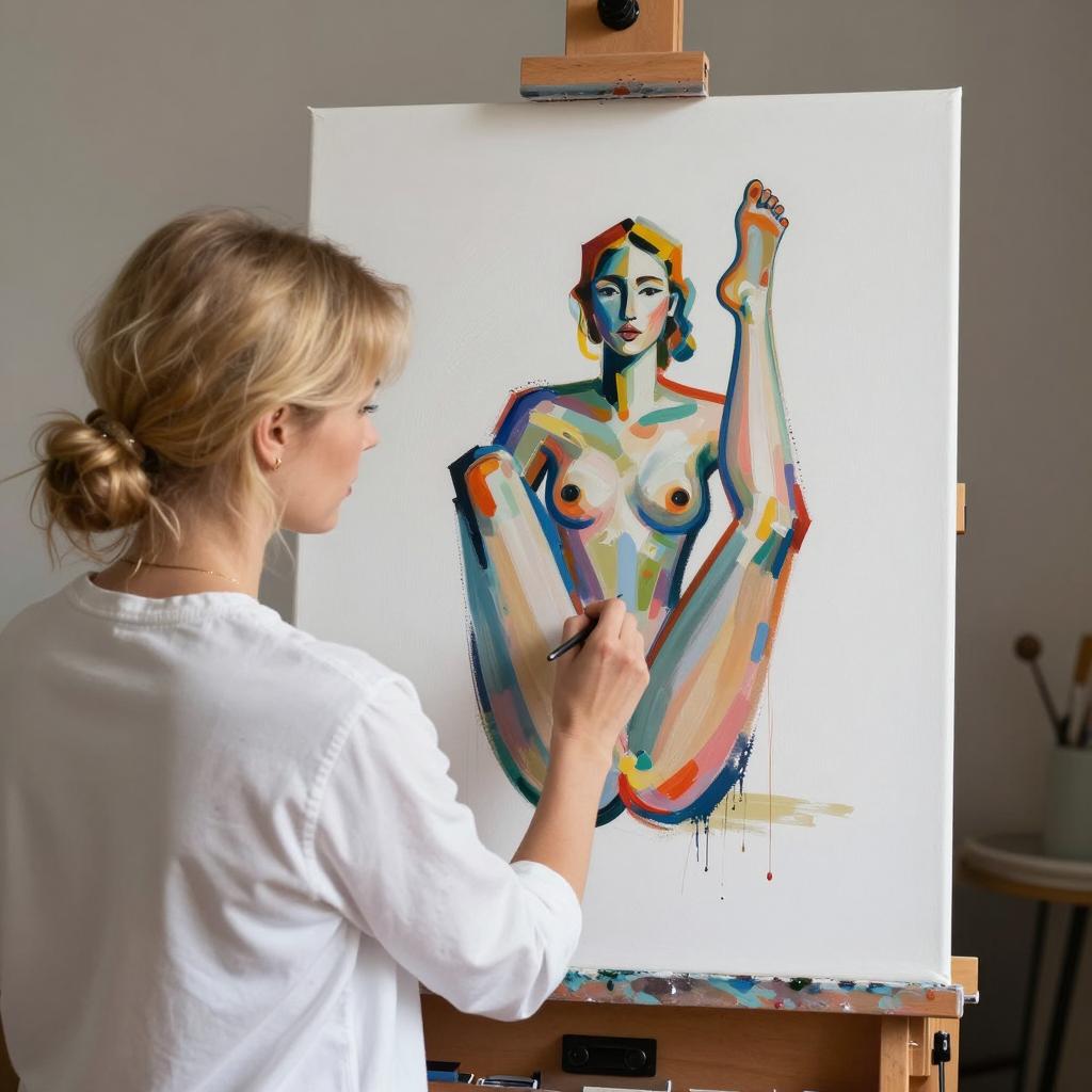 Blonde woman with white shirt painting abstract human figure on white canvas. Figure has colorful splashes, legs bent, and feet pointed upward. Woman's back to viewer, focused on painting. Painting on easel in dimly lit room. Easel centered, woman on left.