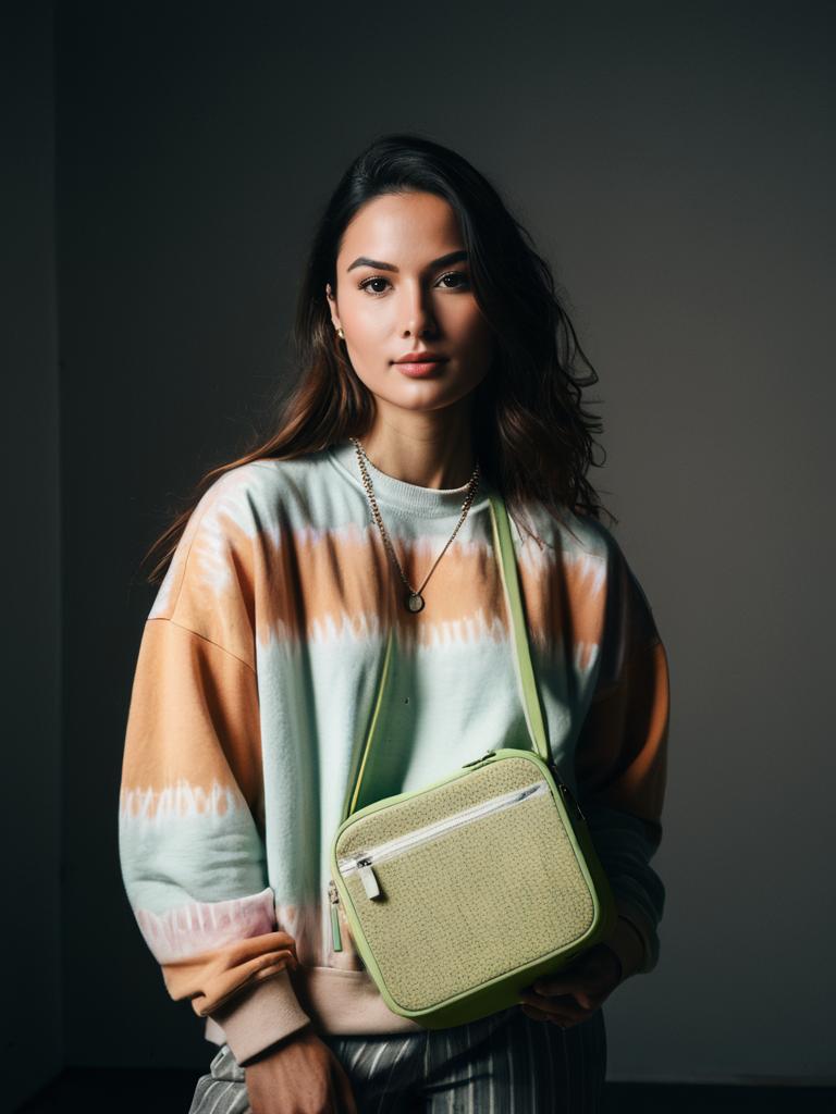 Woman, casual chic, tie-dye sweatshirt in pastel orange and pink tones, crew neck, long sleeves, relaxed fit, paired with vertical striped trousers in white and beige, high-waisted with a loose cut, accessorized with a delicate necklace, holding a lime green mesh tote bag, plain light background --sref 1408