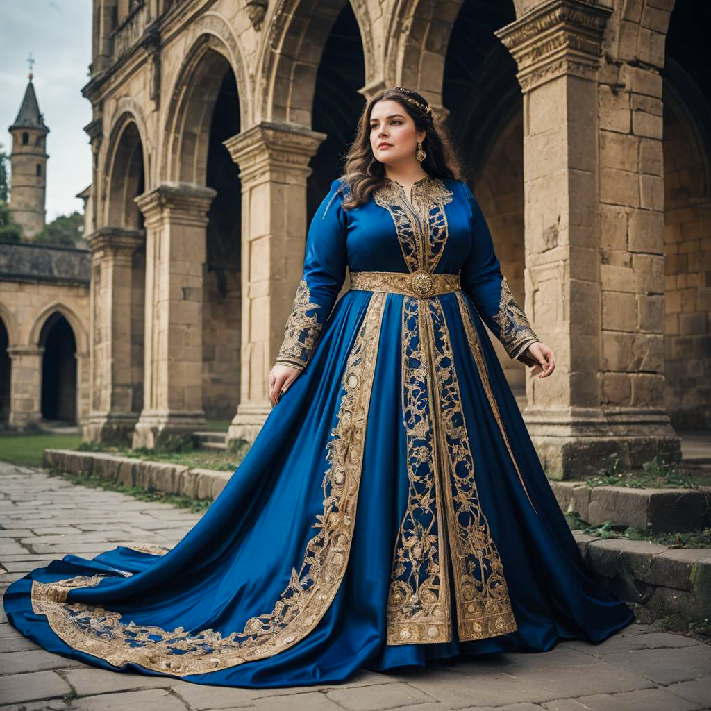 Photo of a slender woman with wavy shoulder-length hair wearing an elegant medieval fantasy-style robe. The emerald green silk dress features flowing fabric with intricate gold trim, ornate details, long sleeves, a high collar, and a gold belt. She is standing in a lush forest clearing with dramatic shadows and rich natural colors, wearing heeled sandals.