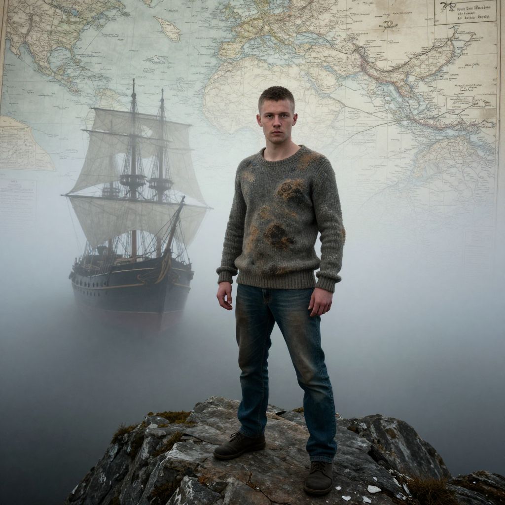 Photograph of a serious, young Caucasian man with short brown hair, standing on a rocky cliff. He wears a dirty, gray, knit sweater with brown stains, dark blue jeans, and black boots. Behind him, a large, old-fashioned sailing ship with tall masts and white sails is partially obscured by thick fog. The background features an old, detailed map of the world, slightly faded, with Europe and parts of North America visible. The overall color palette is muted, with grays, browns, and whites dominating the scene, creating a mysterious, historical atmosphere.