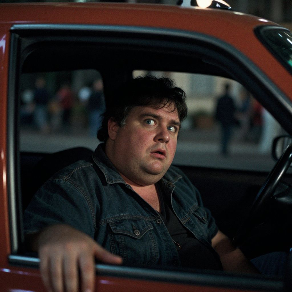 Low angle camera shot of a overweight drunk man sitting in a taxi by night, moody cinematography of roger deakins, shot on film, grain, hyper realistic ,