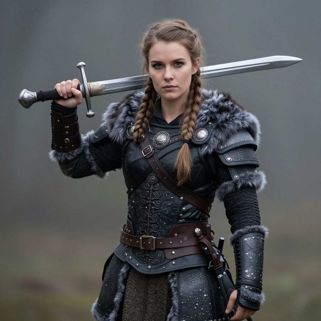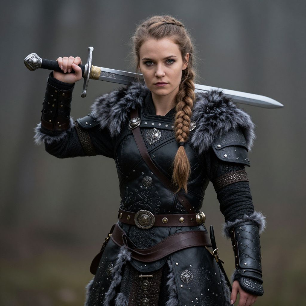 Young woman dressed in detailed Viking-inspired attire, featuring black leather armor adorned with fur trim and metallic accents, stands poised with a long, curved sword held firmly over her right shoulder, her braided hair cascading down her back against a misty forest backdrop.