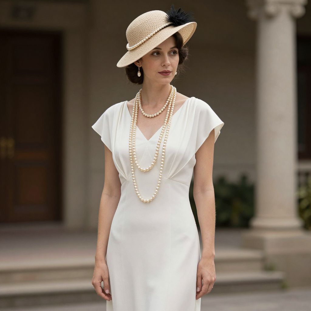 Photograph of a middle-aged woman standing outdoors in front of a building with classical architecture. She has light skin, dark curly hair, and wears a beige straw hat with a black feather. She is dressed in a short-sleeved, white, V-neck dress and a long, double-strand pearl necklace. Her makeup includes dark red lipstick. The background is blurred, showing a stone column and a wooden door. The image has a vintage style, emphasizing classic elegance and sophistication. The woman's posture is relaxed, with her hands by her sides.