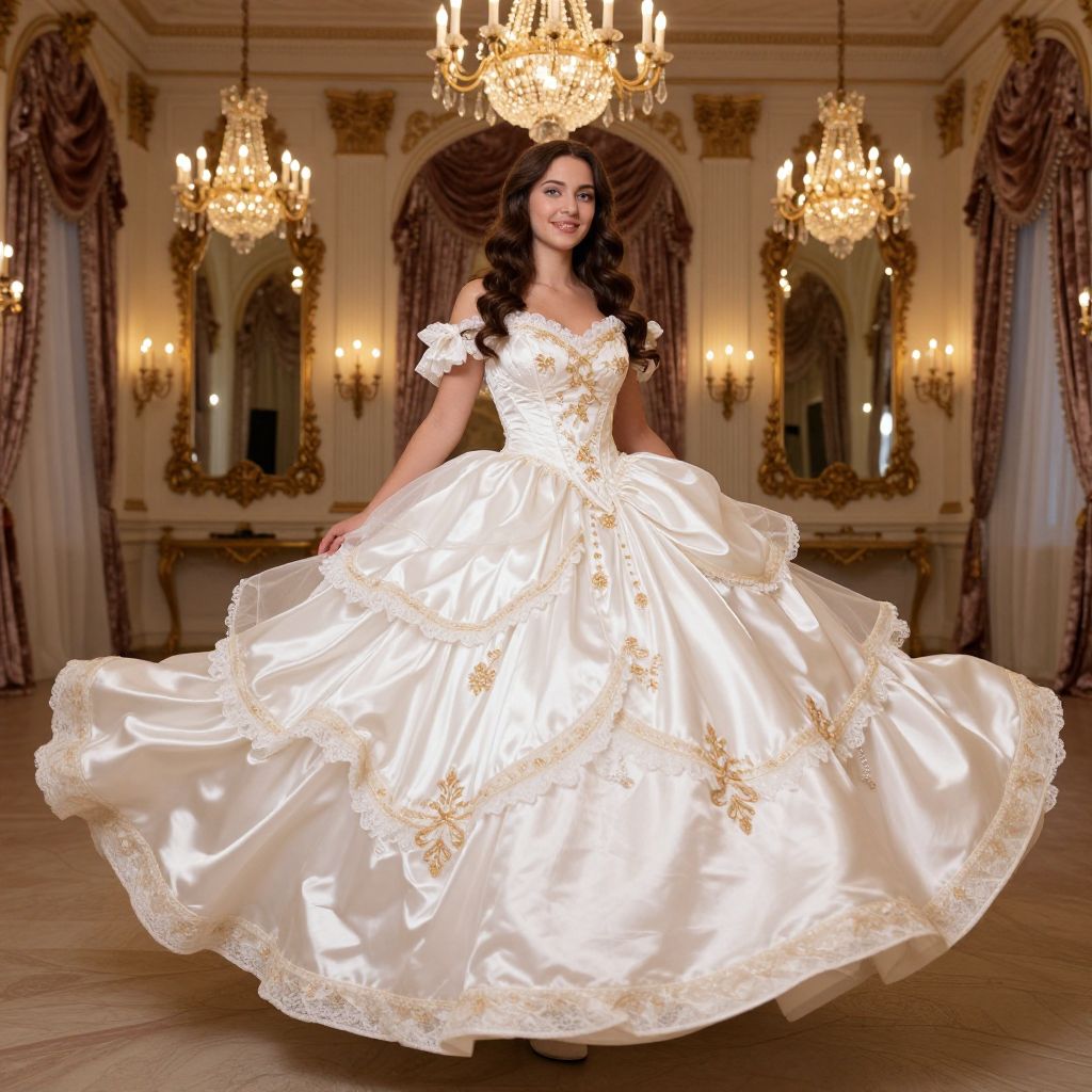 A woman with long wavy brunette hair and soft blue eyes is standing in a grand ballroom, wearing a voluminous poofy ball gown with flowing satin layers and a full skirt that billows dramatically as she turns. The gown is adorned with delicate lace trim and golden embroidery, glowing under vintage chandelier lights. The background features ornate mirrors, velvet drapes, and a candlelit atmosphere, creating a dreamy, glamorous costume celebration.. The woman has big breasts and cute face