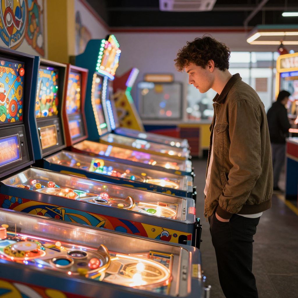 In the heart of a vibrant amusement hall, a young man stands amidst a colorful array of pinball machines, their lights glowing with an inviting warmth. The scene is bathed in a soft, natural lighting that enhances the vivid hues of the pinball machines, each adorned with intricate designs and bright, eye-catching colors. The man, dressed in a casual brown jacket, appears engrossed in the game, his posture relaxed yet focused. The pinball machines, arranged in a semi-circle, create a dynamic composition that draws the viewer's eye from the foreground to the background. The depth of field is shallow, with the man and the closest machines in sharp focus, while the background blurs into a tapestry of lights and colors, adding a sense of depth and dimension to the scene. The overall atmosphere is one of nostalgia and excitement, capturing the essence of a classic amusement hall where the joy of pinball is celebrated.