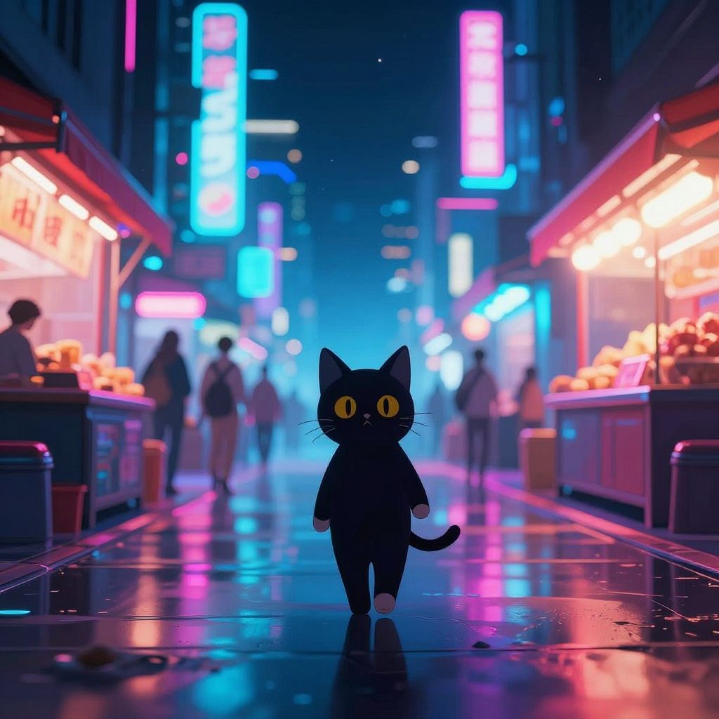 A digital illustration depicts a neon-lit, futuristic street market at night. A small, black, cat-shaped silhouette stands in the foreground, facing away, with its tail up. The street is wet, reflecting vibrant pink, blue, and purple neon signs from both sides. Stalls on either side display bright, warm yellow lights and baskets of oranges. Blurred figures of people walk in the background. The scene has a cyberpunk aesthetic, with sharp contrasts between the neon lights and dark surroundings, emphasizing a mysterious, urban atmosphere.