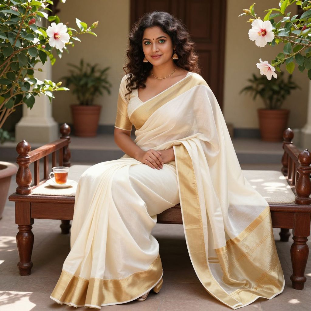 A beautiful South Asian woman with warm brown skin, curly hair, and bright green eyes is wearing a soft silk saree in gentle cream and gold, flowing gracefully in a sunny courtyard adorned with blooming hibiscus flowers and traditional wooden furniture. The saree drapes elegantly over her body, with the inner and outer layers finely detailed, showing the subtle sheen of silk in natural light. She is smiling softly, sitting on a low terrace bench with a cup of jasmine tea, the setting capturing classic Indian rural elegance.. The woman has big breasts and cute face