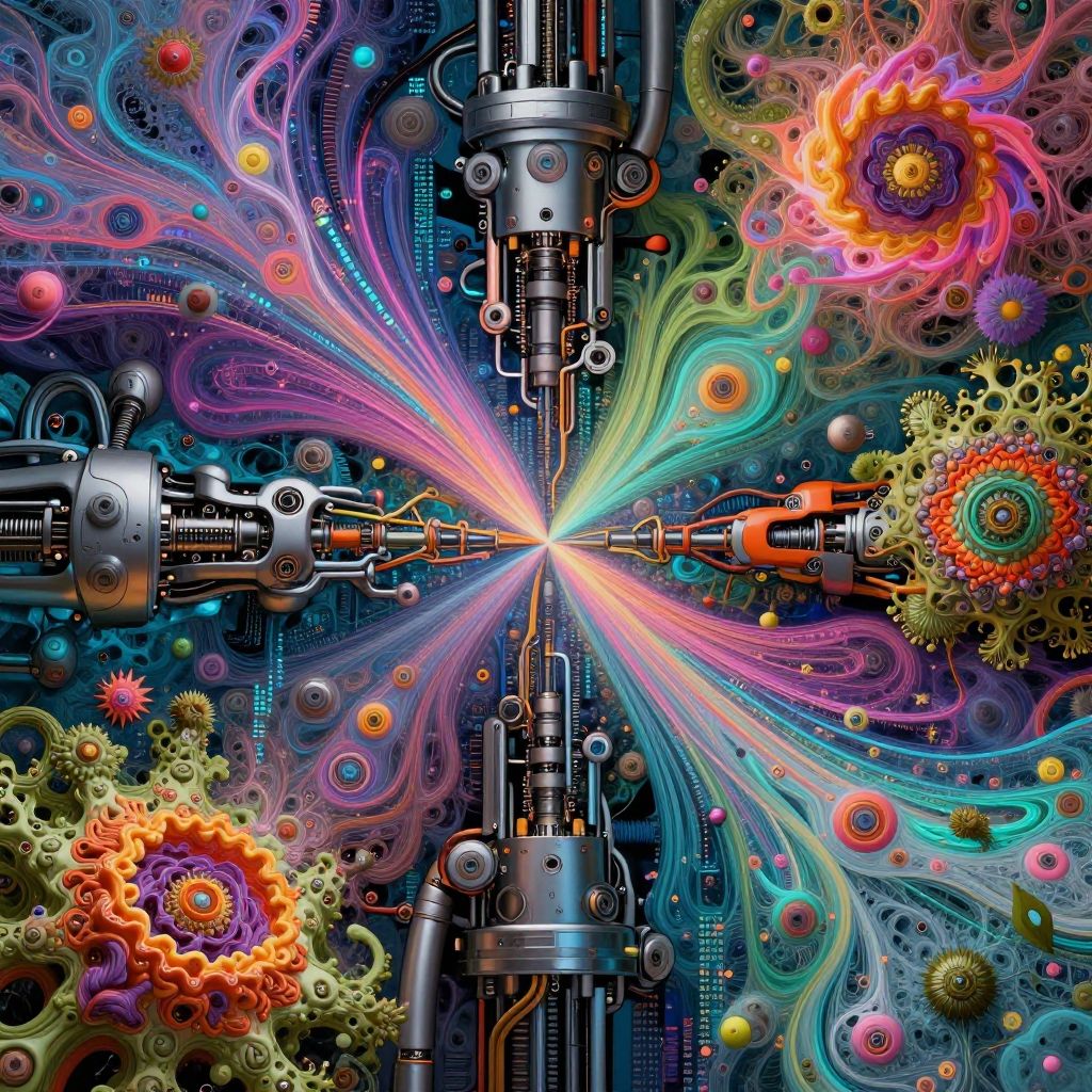 Ai generated art from images, a vibrant montage of mechanical and organic elements interwoven seamlessly, colorful fractals and data streams flowing through natural textures, capturing the essence of AI creativity and digital imagination