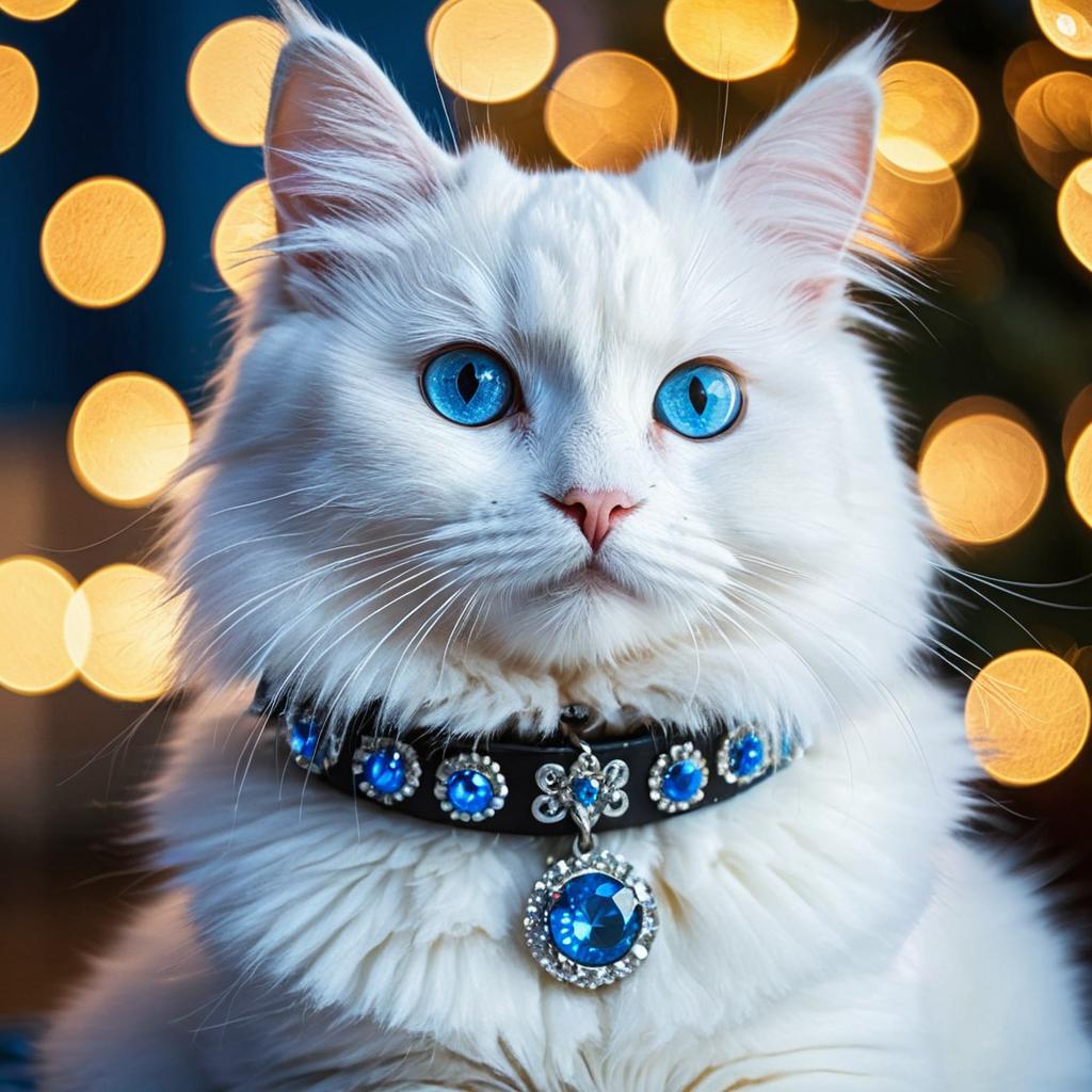 Cute white fluffy cat with large expressive blue eyes wearing a sparkling blue gem-studded collar, sitting on a soft surface with glowing warm bokeh lights in the background, fantasy style, bright vivid colors, sparkling details, white and blue color scheme