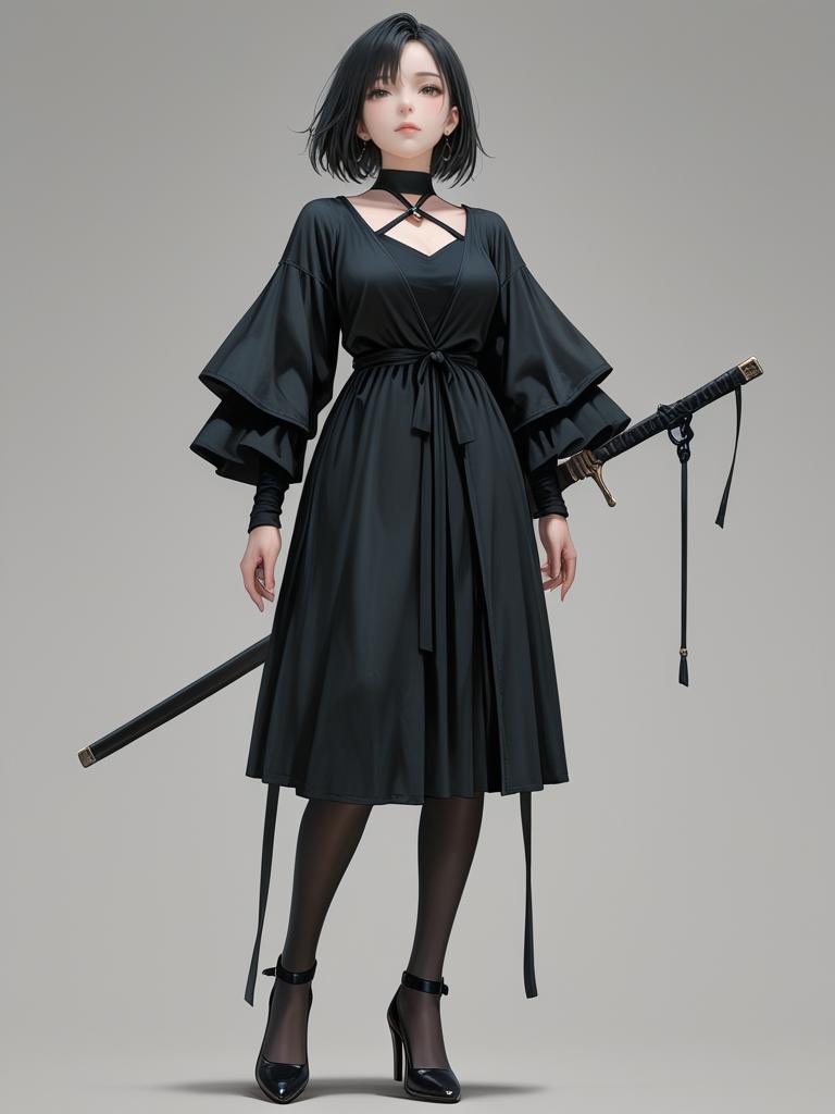 This digital anime-style illustration features a young woman with short, black hair and fair skin, wearing a black and white maid outfit. The outfit includes a black beret with a small white emblem, a black blouse with white trim, and a white apron dress with black buttons and a black skirt underneath. She stands confidently with one hand on her hip and the other resting on a large, brown, ornate sword that leans against her right side. She wears black ankle socks and shiny black shoes. The background is plain white, with gray borders on the left and right sides of the image.