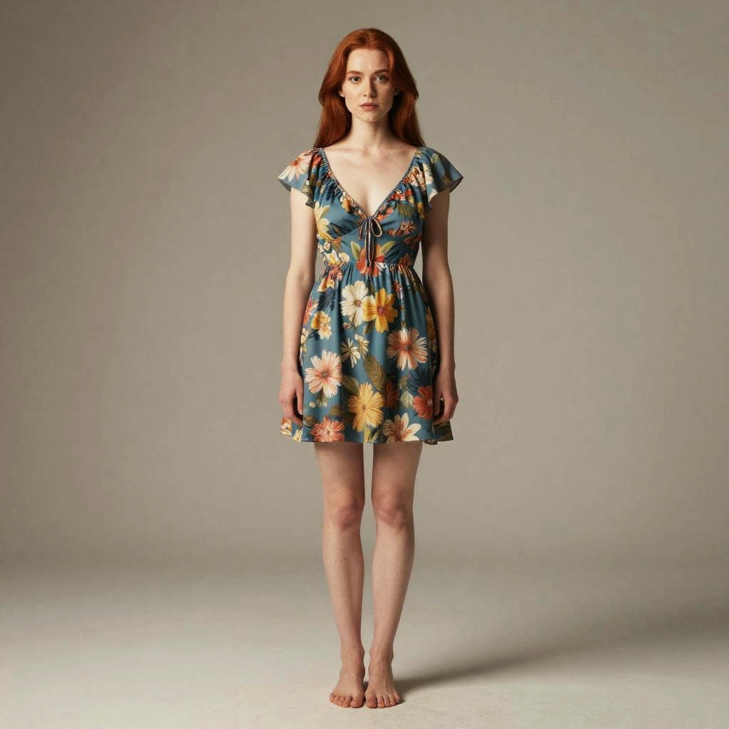 Full-body photo of a woman with fair skin and straight red hair, wearing a short floral summer dress with a deep neckline and flutter sleeves. She stands barefoot against a simple, neutral background with a confident expression, captured with cinematic lighting and perfect shading.