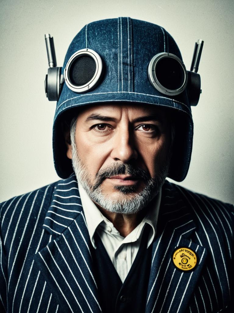 Portrait of a middle-aged man with a gray beard wearing a distinctive blue denim helmet with attached round goggles and antennas. He is dressed in a dark pinstripe suit jacket over a white shirt and black vest, presenting a serious expression against a neutral background. The style reflects a cinematic, humorous cosplay character reminiscent of a movie poster.