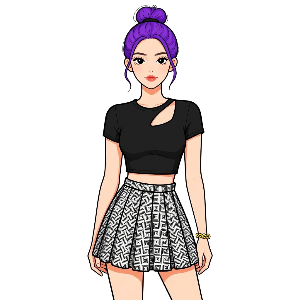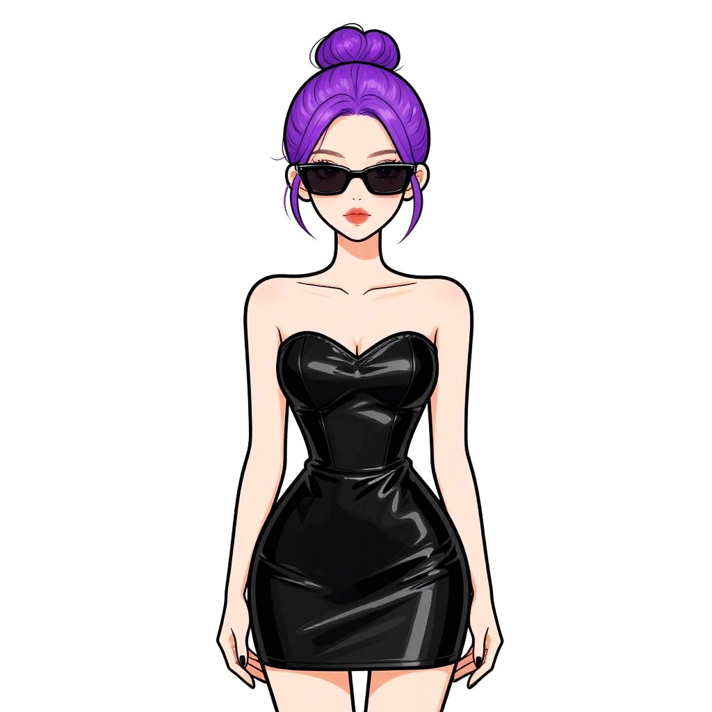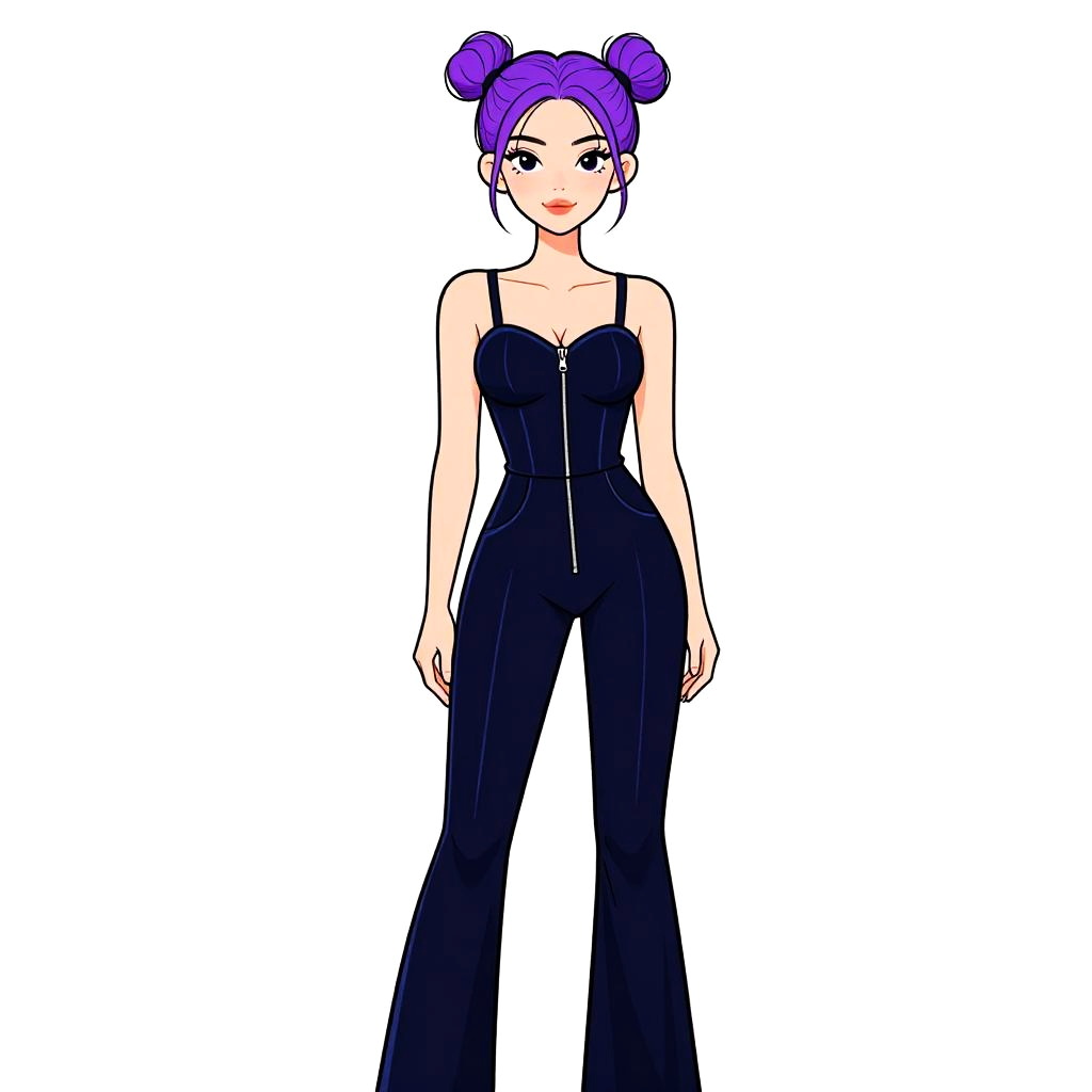 Woman with pretty face and pretty hair. Woman, minimalist chic, navy blue velvet jumpsuit, thin spaghetti straps, fitted bodice with straight neckline, vertical zipper closure at front, high-waisted flared leg pants, clean lines, no visible accessories, hair in twin buns with loose strands, white backdrop in a photo studio setting. --sref 1467