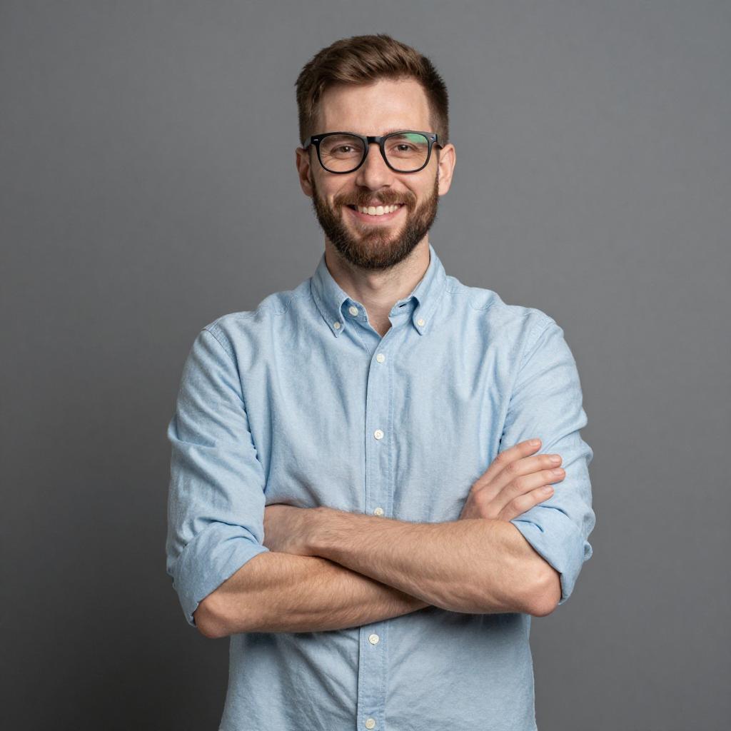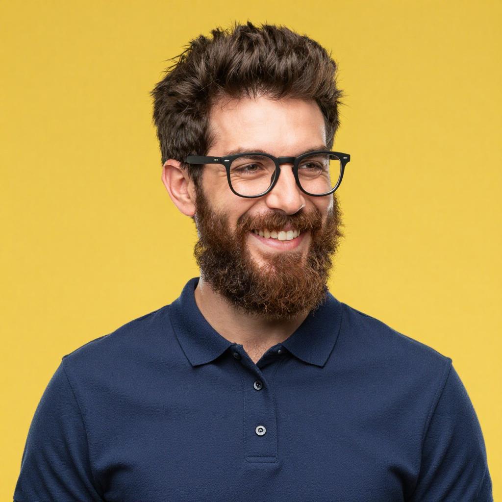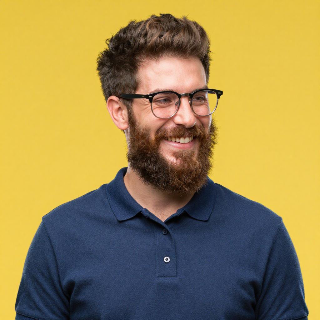 Photograph of a smiling man with a full brown beard and short, dark brown hair, wearing black-framed glasses and a navy blue polo shirt. The background is a solid bright yellow, making him stand out. He's looking slightly to the side, showing his teeth in a friendly grin. The lighting is even, highlighting his happy expression.