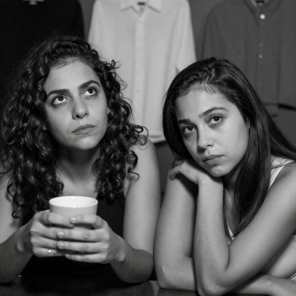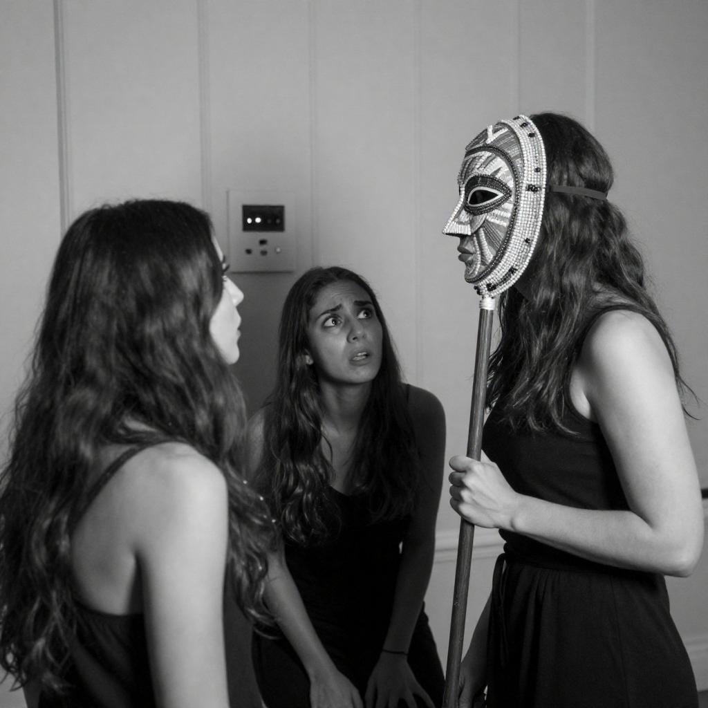 Black and white photograph showing three women indoors. One woman on the right wears a detailed beaded tribal mask and holds a staff. Two other women face her with intense, frightened expressions. The woman in the center is crouching and looking up, while the woman on the left is partially turned away. All have long hair and wear dark sleeveless clothing. Background features vertical paneling and a small control panel.