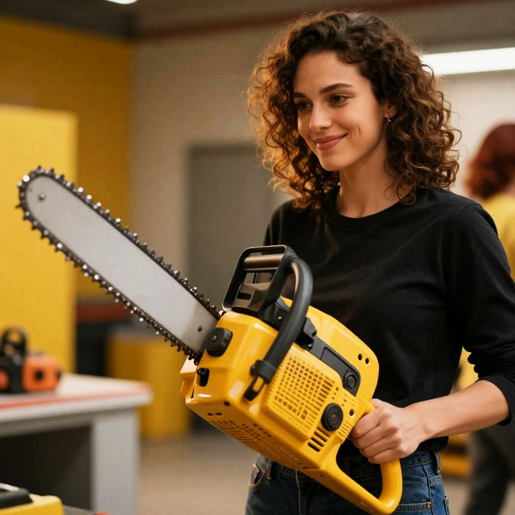Woman with curly brown hair, wearing a black long-sleeve shirt, holding a yellow Ryobi chainsaw with both hands, smiling. Chainsaw has white and black blades. Background has blurred yellow and white objects. Another person with red hair partially visible in background. Warm yellow lighting.