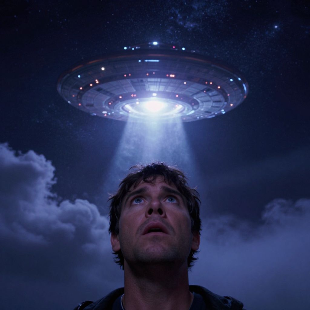 Photograph of a man with short, dark, slightly messy hair, gazing upward at a glowing, circular UFO with lights, against a dark, starry night sky. Blue and white lights from the UFO illuminate the man's face, which shows a mix of wonder and curiosity. He wears a dark jacket, and the background includes fluffy, dark blue clouds. The image has a surreal, sci-fi feel, with a strong contrast between the dark sky and the bright UFO lights. The man's expression and the UFO's presence create a sense of awe and mystery.